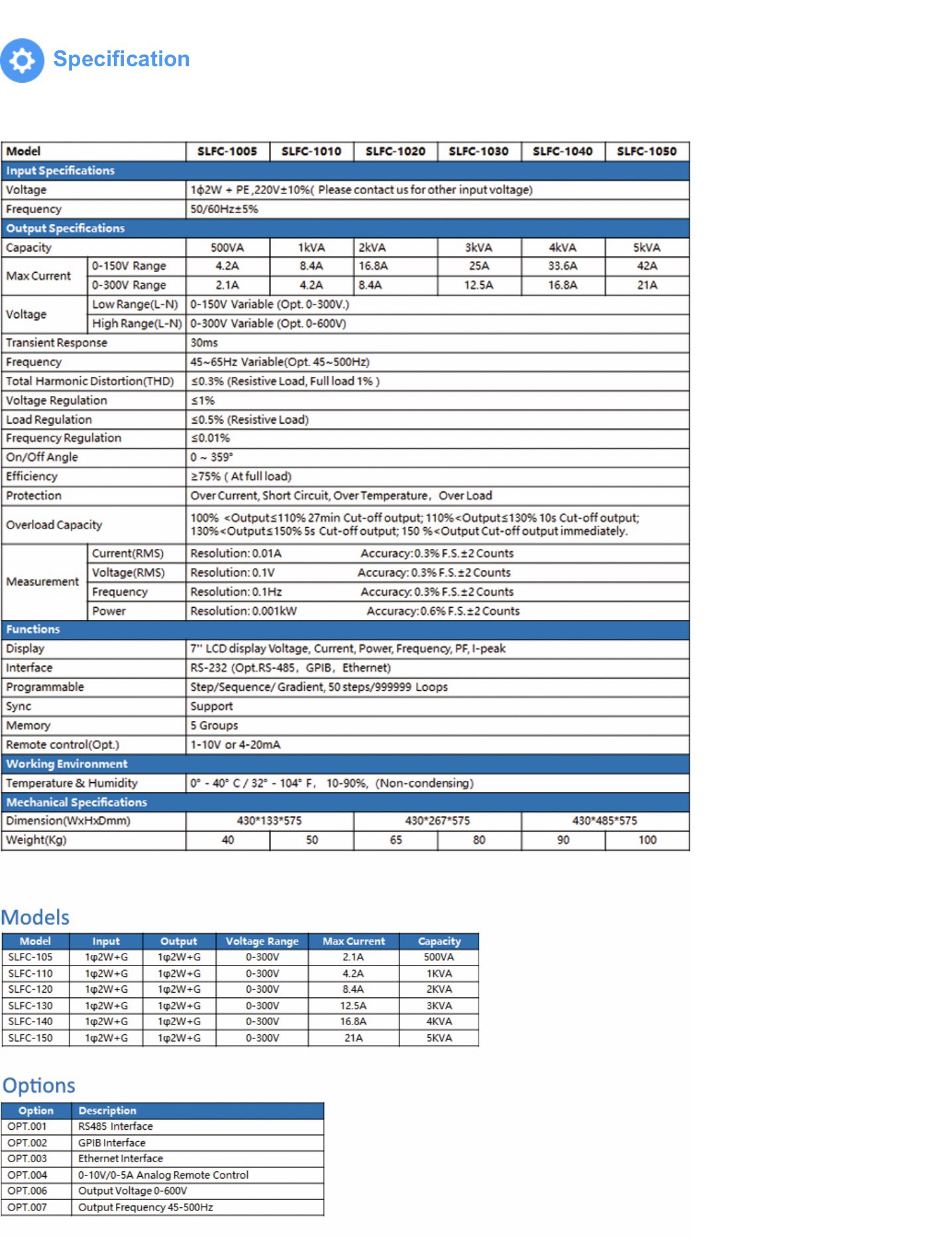 The SLFC series Programmable Linear AC Power Source output power range from 500VA to 5kVA, output voltage range 0-300V (Opt. 0-600V), and output frequency range 45-65Hz adjustable (Opt. 45-500Hz)